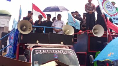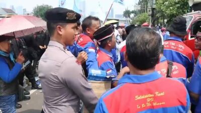 Jakarta – Aksi simpatik ditunjukkan aparat kepolisian saat mengawal unjuk rasa buruh di depan Gedung DPR, Jalan Gatot Subroto,